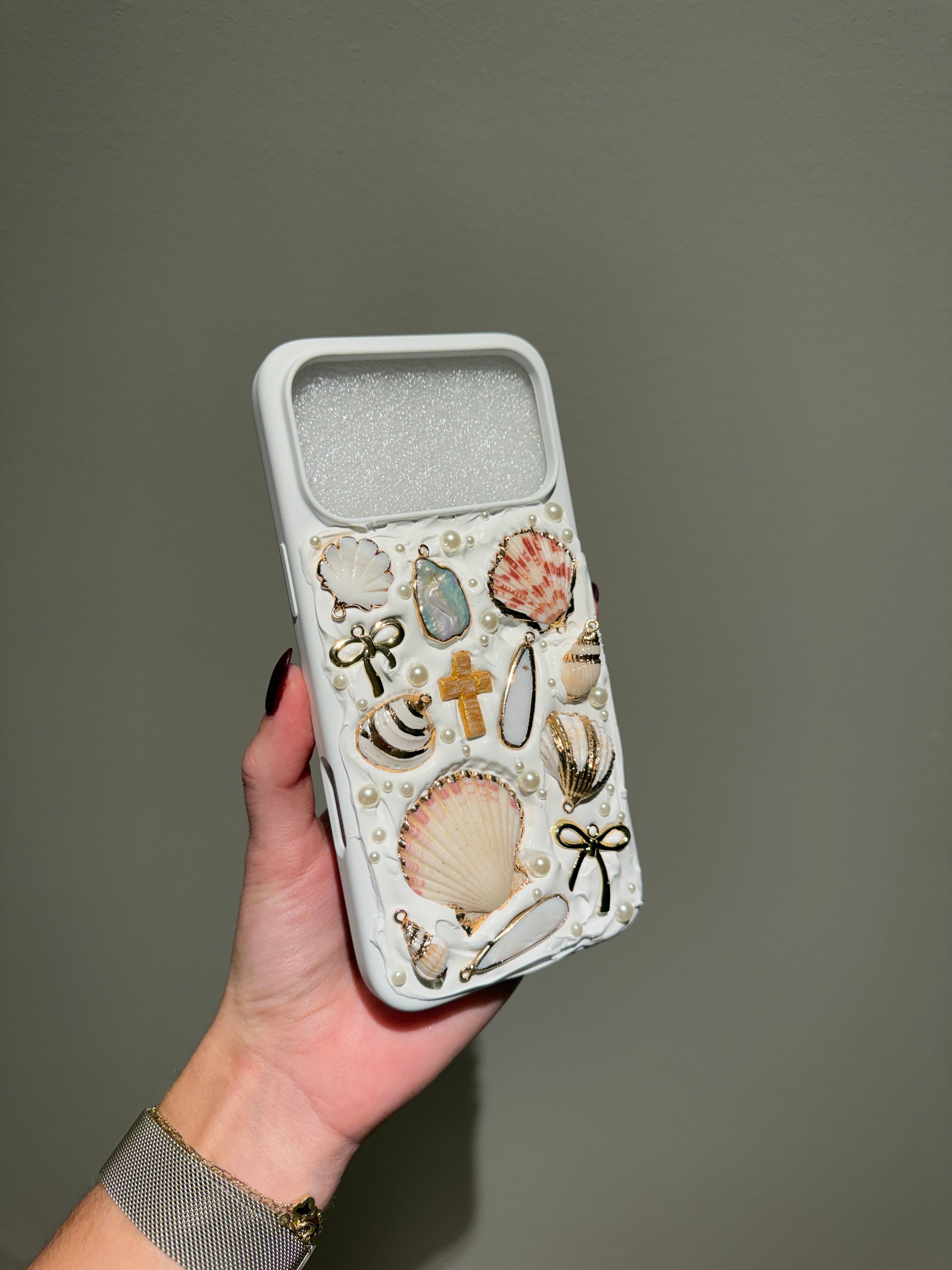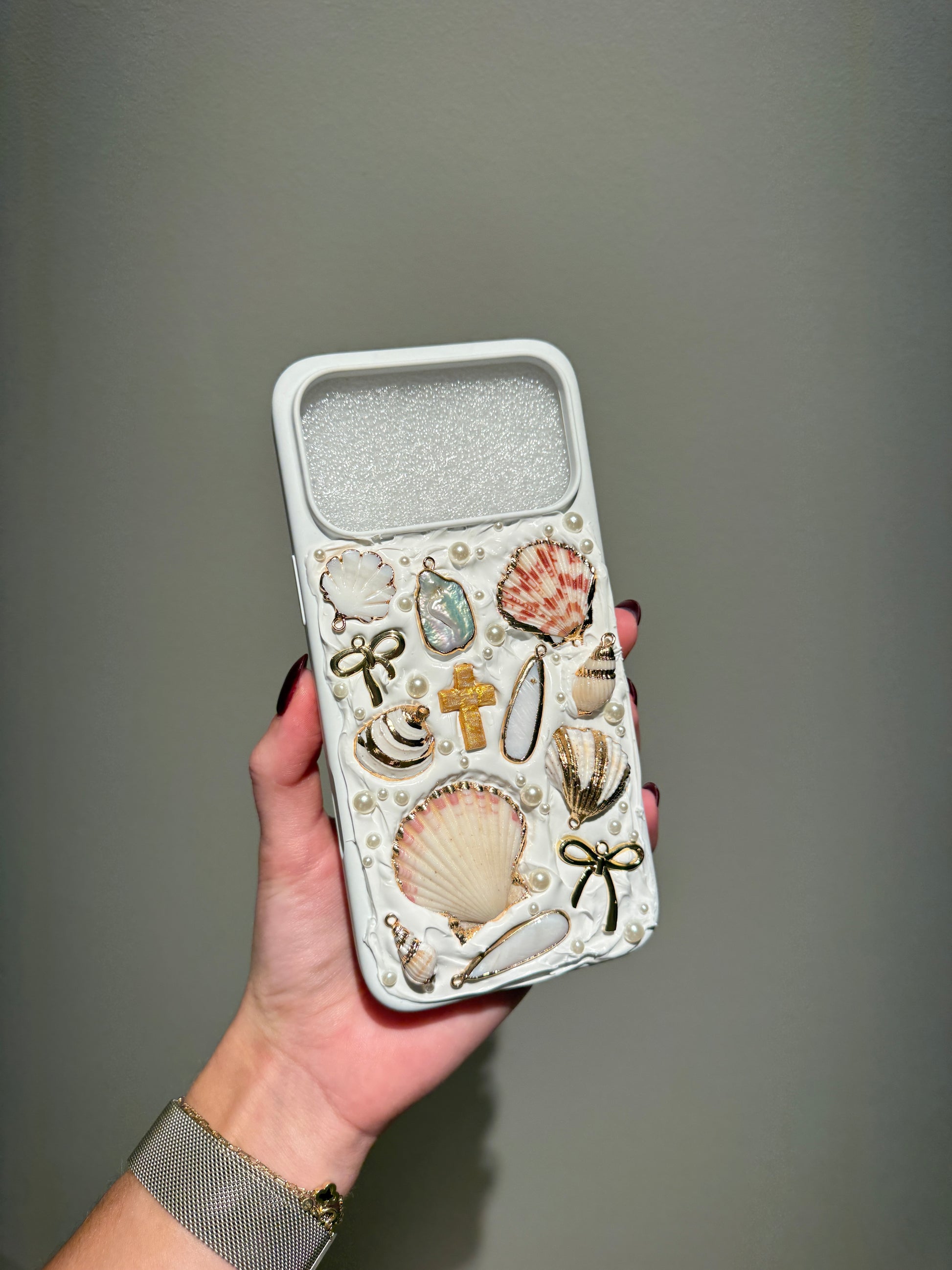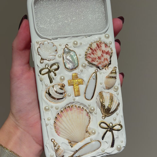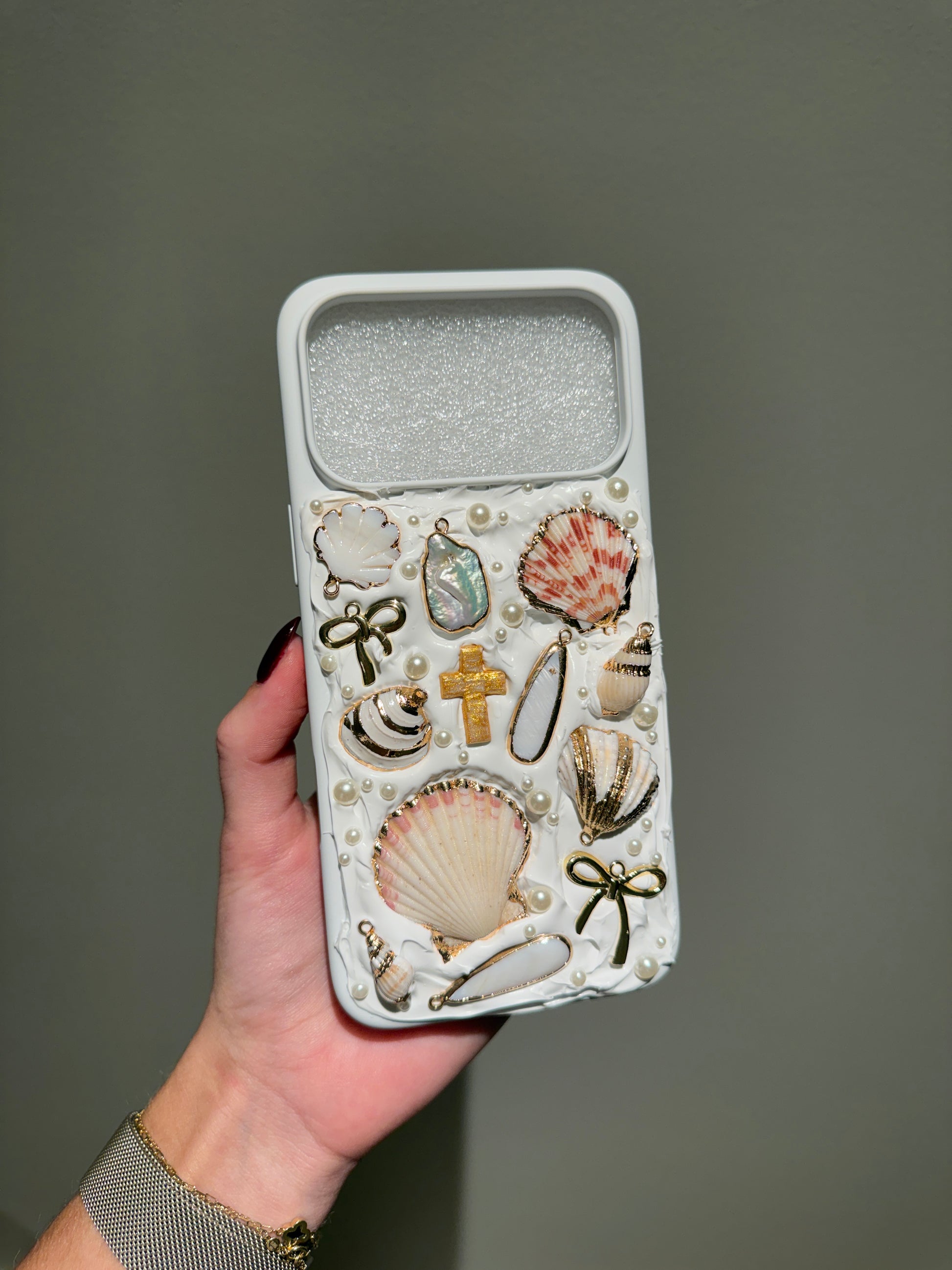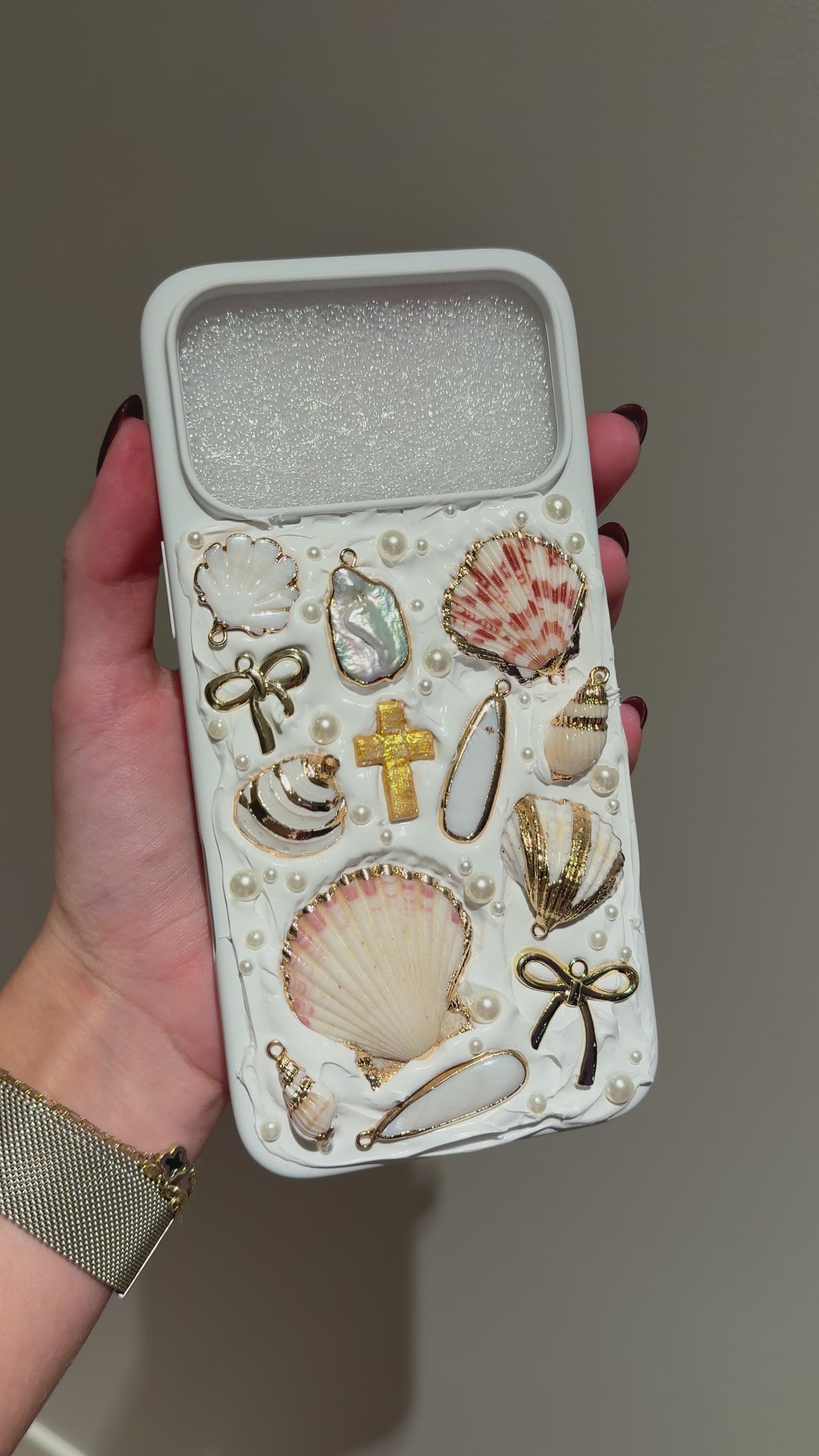 Add a touch of seaside elegance to your everyday essentials with this handmade ocean-inspired phone case, crafted using lightweight air-dry clay for a beautifully sculpted, one-of-a-kind texture. Each piece is thoughtfully adorned with realistic seashell charms, golden accents, and glossy pearls, creating a luxurious coastal aesthetic.