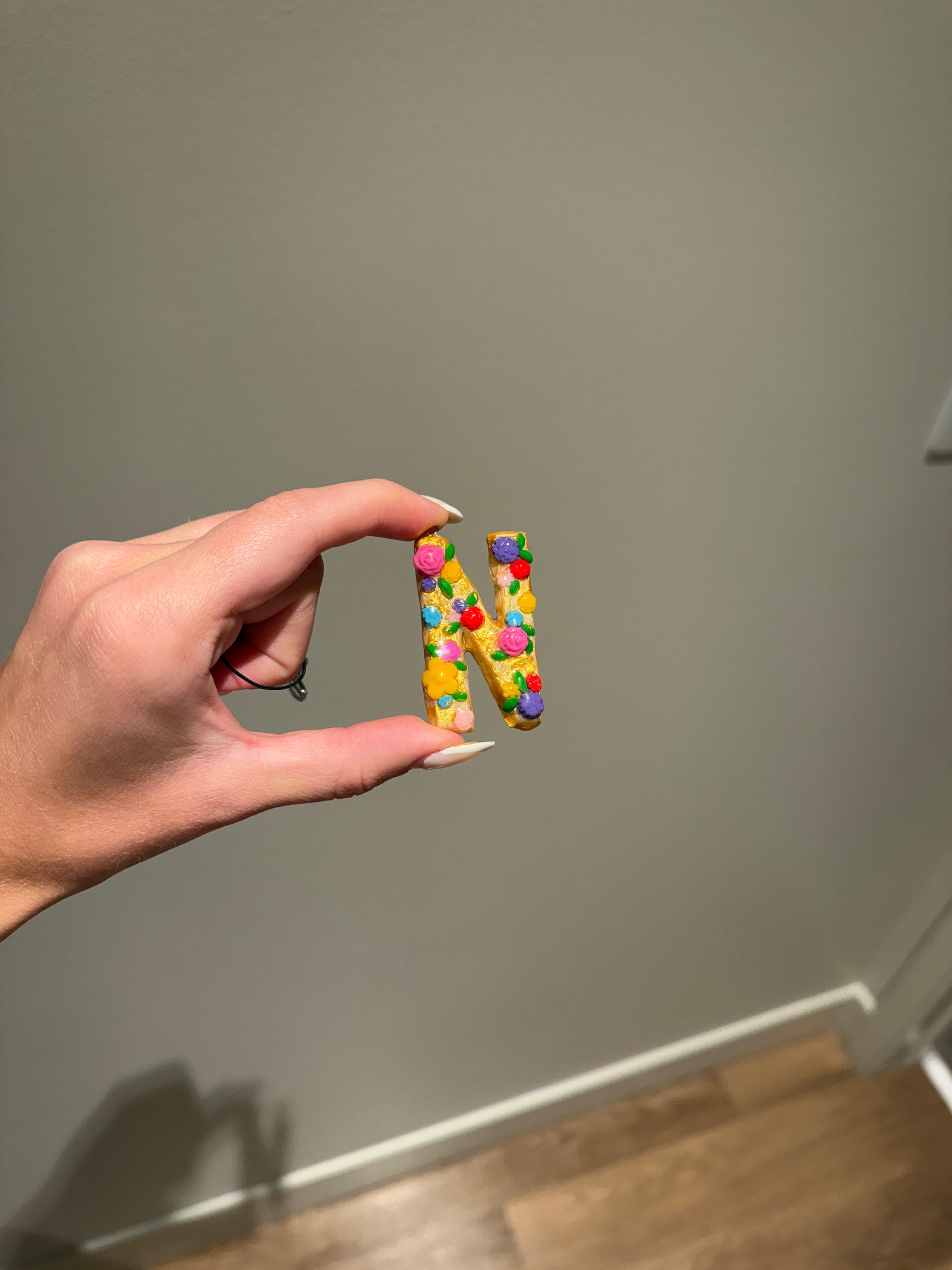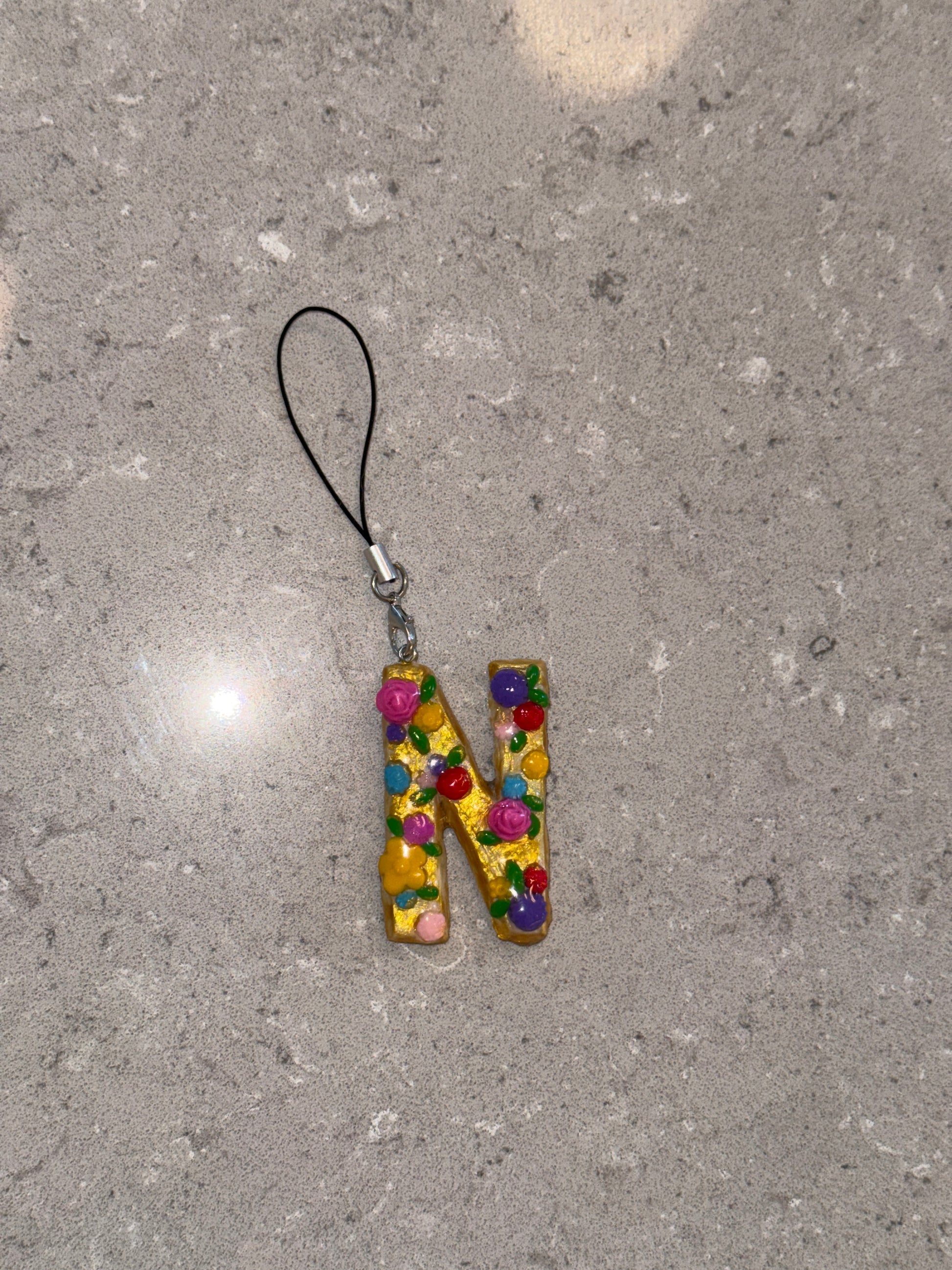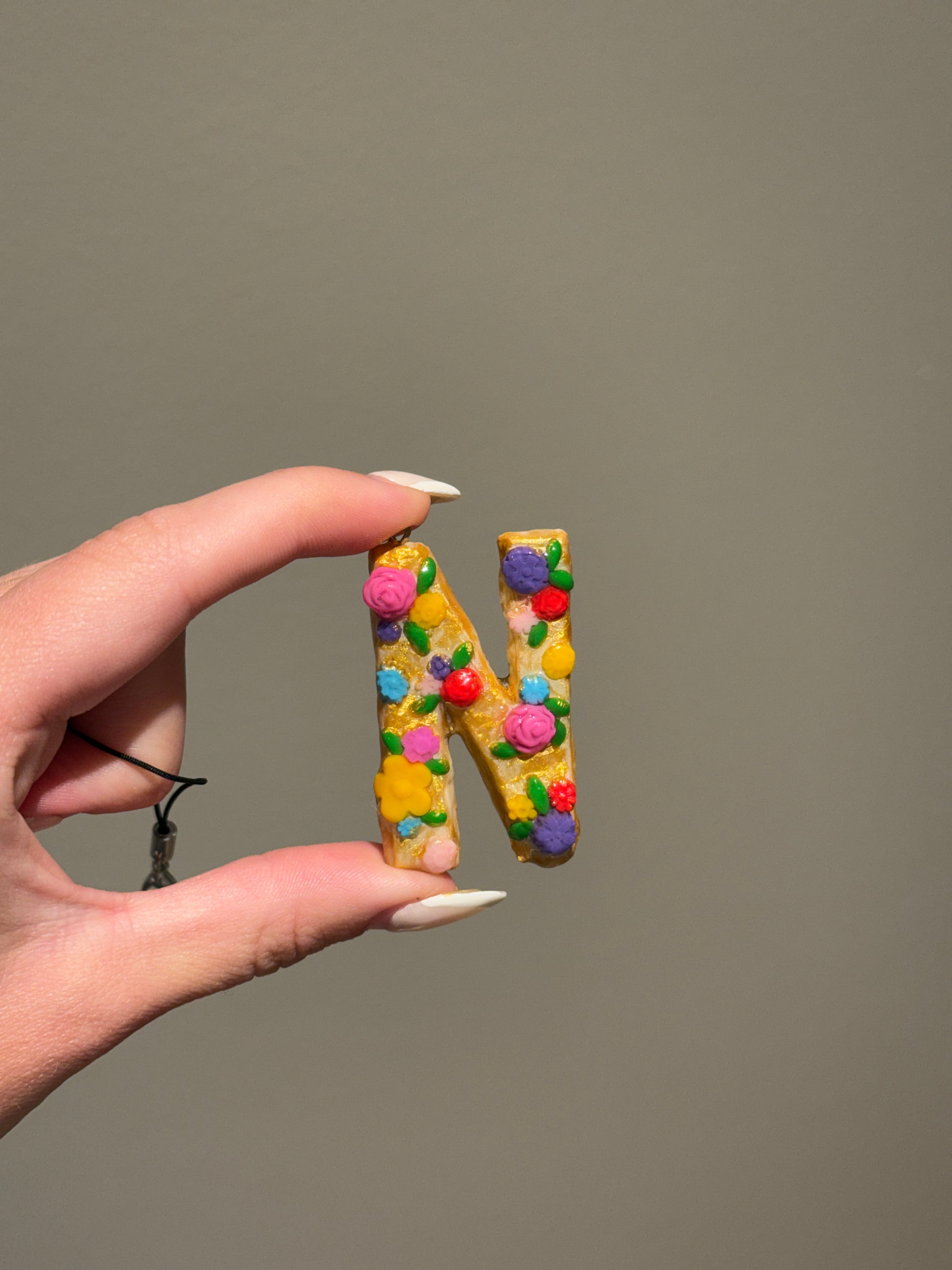 This handmade floral letter keychain, is personalized with your initial and decorated with colorful little flowers on a golden base. Cute, lightweight, and one-of-a-kind. Perfect for keys, bags, or gifting!